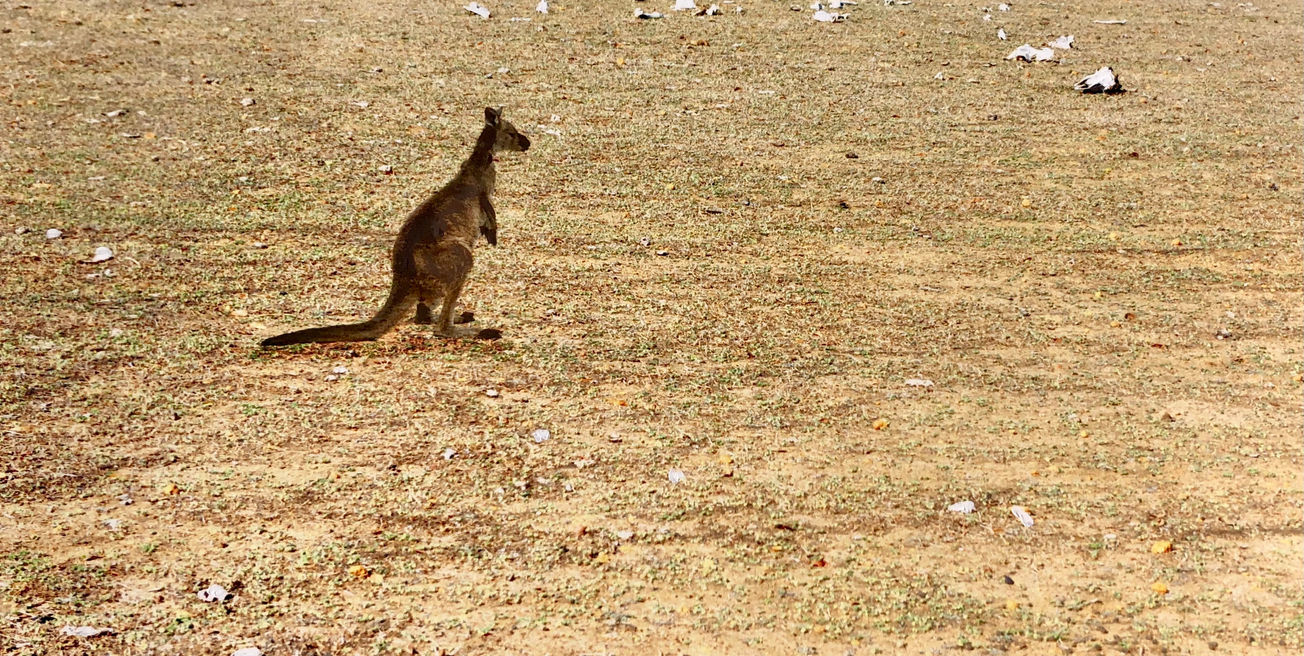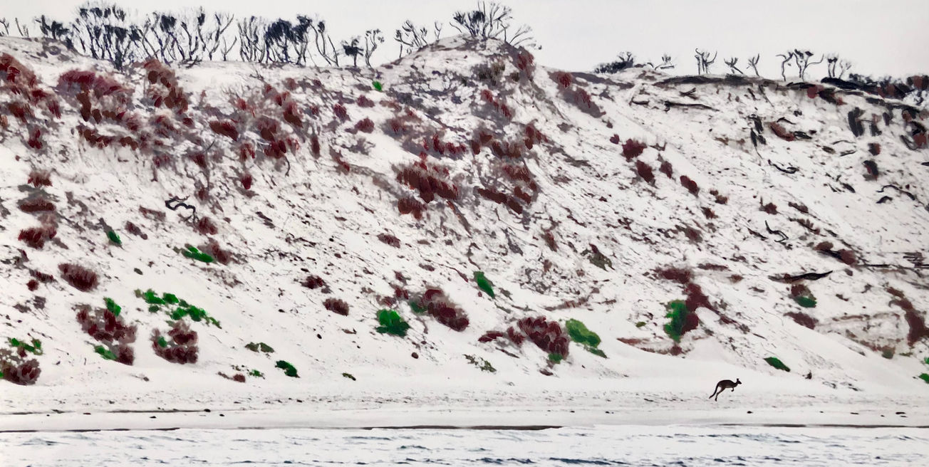 I followed one bewildered roo amidst the ruins of a resort & returned him on canvas to the charred remains of his home & habitat. He leads us across the island from the sand dunes to the malee & beyond.