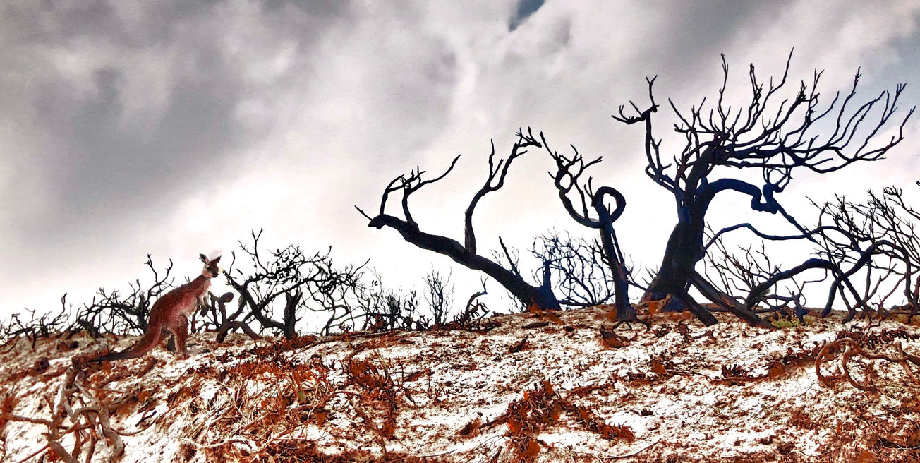 Climate crisis, March, 2020: Between fire & pandemic I stand among the ashes of Kangaroo Island.